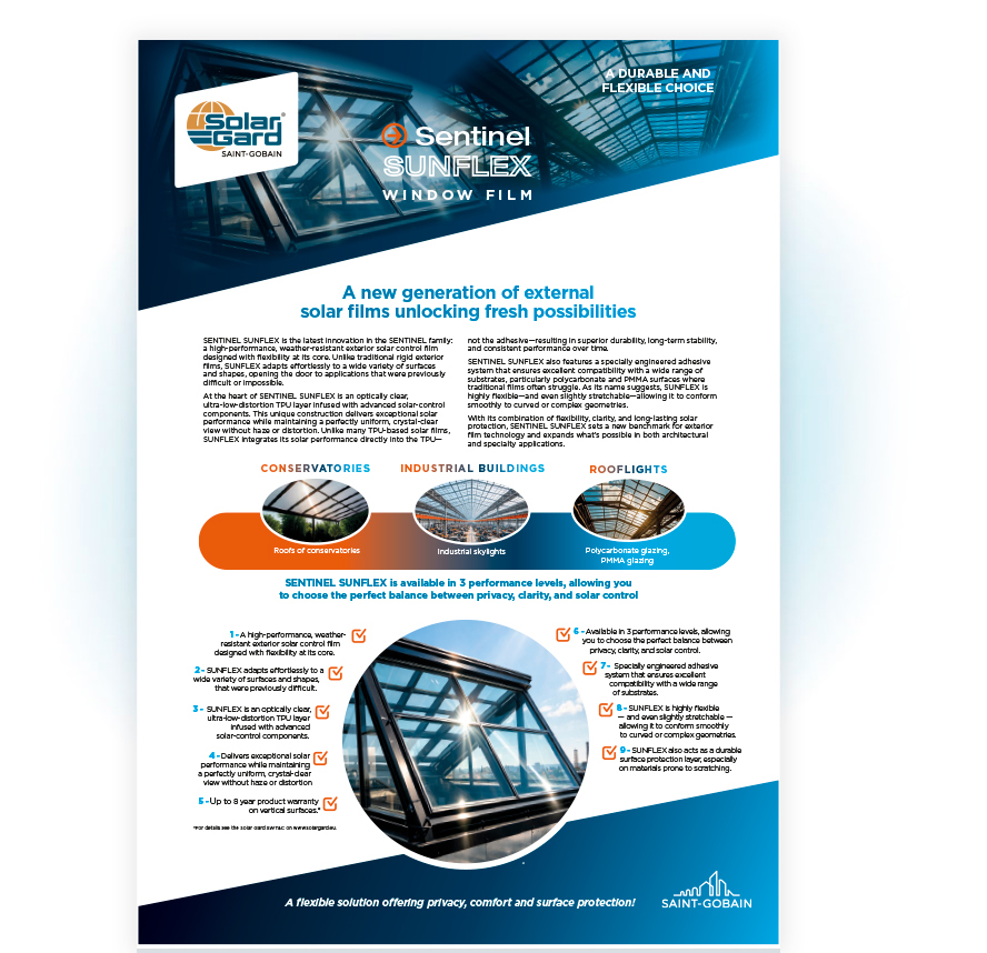 SENTINEL SUNFLEX is the latest innovation in the SENTINEL family: a high‑performance, weather‑resistant exterior solar control film designed with flexibility at its core. Unlike traditional rigid exterior films, SUNFLEX adapts effortlessly to a wide variety of surfaces and shapes, opening the door to applications that were previously difficult or impossible.